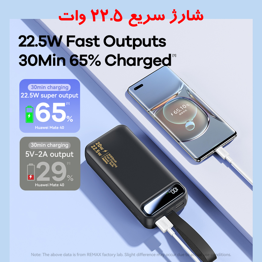 یک ویژگی مهم و جذاب این پاوربانک چراغ LED هست که در پشت این دستگاه تعبیه شده است. این چراغ قدرتمند دارای نور درخشان و با قدرت بالایی است که در مکان های تاریک به شدت کمک حال شما خواهد بود. ویژگی بعدی این پاوربانک استفاده از بند محکم در قسمت بالایی دستگاه است که به راحتی و بدون نگرانی از پارگی میتوانید پاوربانک را جابه جا کنید. این پاوربانک دارای دو پورت خروجی USB-A با توان 22.5 وات و یک پورت Type-C با ماکزیمم توان 20 وات است و از فناوریهای شارژ سریع PD و QC نیز پشتیبانی میکنند. و همچنین قابلیت شارژ همزمان سه دستگاه را نیز داراست. ورودی های این پاوربانک از دو نوع Type-C و Micro با قابلیت شارژ سریع 18 وات می باشد که این ویژگی مهم در شارژ کردن پاوربانک بسیار موثر است. میزان شارژ این دستگاه از طریق نشانگر دیجیتالی است که روی آن تعبیه شده است و میتوانید در هر لحظه میزان شارژ دستگاه را مشاهده نمایید.